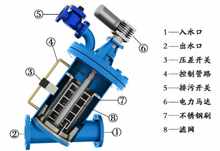 流体从进口流入,从过滤器内楔形滤筒细小的缝隙中流出,杂质微粒很容易被截留下来,杂质微粒在滤网表面积聚时,会产生压差。 当进出口压差达到0.5kg/cm2时(可调),过滤器的反洗系统会开始自动工作。操作由设置在本体上的压差控制器,电动排污阀及靠马达带动的一个能旋转的不锈钢清洗刷,杂质微粒很容易被钢刷刷下来,然后经排污阀排出,反洗时间持续15秒左右(可调),反洗时不断流。